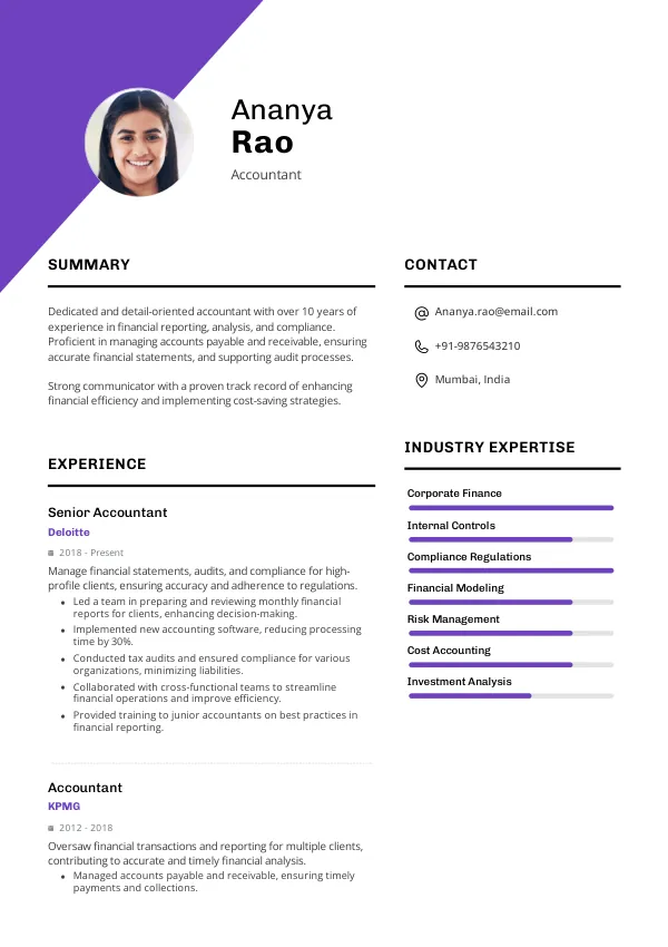 - As an Accountant in India, your resume must highlight your expertise in financial reporting and compliance.