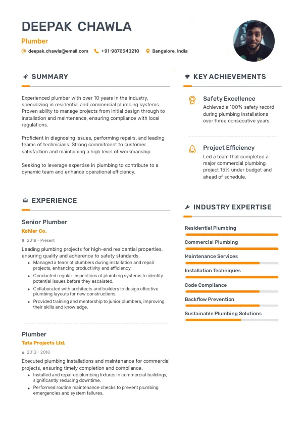 - As a plumber in India, your resume should highlight your experience with various plumbing systems and your ability to comply with local regulations.