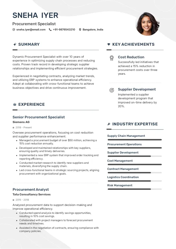 - Tailored resume examples that reflect the expectations of Procurement Specialists in India.